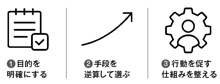 目的から考える設計を実践するためには、「なぜ作るのか」「どう届けるのか」「どう活かすのか」という流れをあらかじめ描いておくことが大切です。